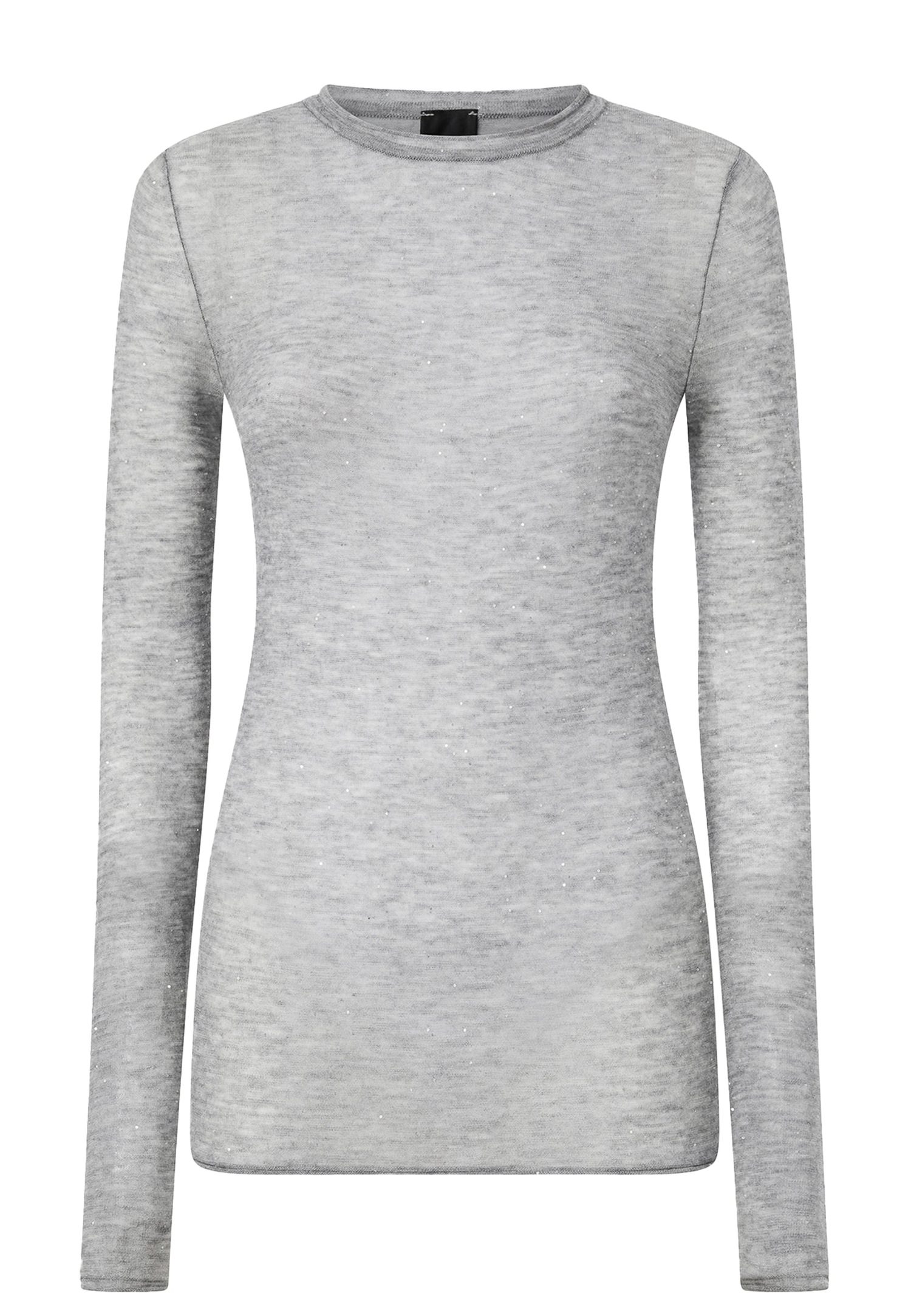 Джемпер от Pinko выполнен из полупрозрачной смесовой шерсти с добавлением микро-пайеток, которые интегрированы в ткань, создавая нежное мерцание. Эта техника привносит в изделие элегантность и утонченность, добавляя игривую нотку в повседневный стиль. Цвет серый, универсальный и спокойный, делает джемпер подходящим для различных ансамблей. На спинке находится лейбл с логотипом бренда, аккуратно завершая образ и добавляя фирменный акцент. Этот элемент подчеркивает принадлежность к бренду Pinko, известному своими стильными и современными решениями. Изделие прекрасно подойдет как для повседневной носки, так и для более формальных встреч, добавляя в любой образ стиль и шик.