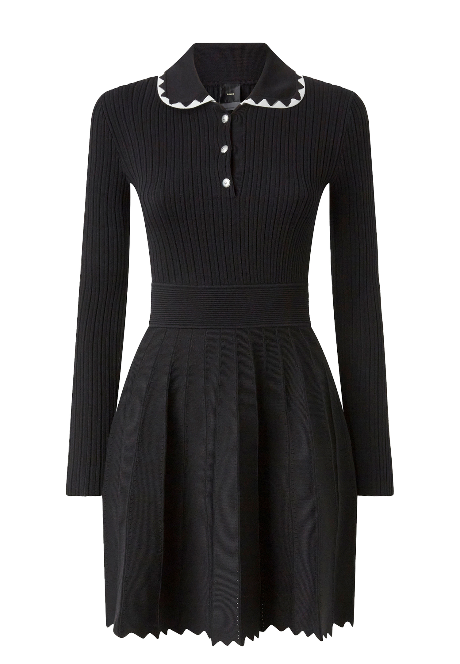 Мини-платье представляет собой интересное сочетание стильных элементов, создающих гармоничный и современный образ. Это изделие с длинными рукавами обеспечивает баланс и элегантность, позволяя использовать его в разных погодных условиях. Основным акцентом дизайна является плиссированная юбка, которая придает игривость и динамичность. Верхняя часть платья оформлена в виде поло с отложным воротником, что добавляет классический штрих в общий облик. Модель выполнена из угольно-черного трикотажа, который подчеркивает силуэт и придает ему глубину. Контрастная окантовка на воротнике вносит яркость и выделяет его на фоне основного цвета. На спине расположена небольшая, но заметная вышивка с логотипом Pinko, что служит знаком качества и стиля. Это платье идеально подойдет для различных мероприятий, будь то деловая встреча или вечерний выход, сочетая в себе комфорт и современность.
