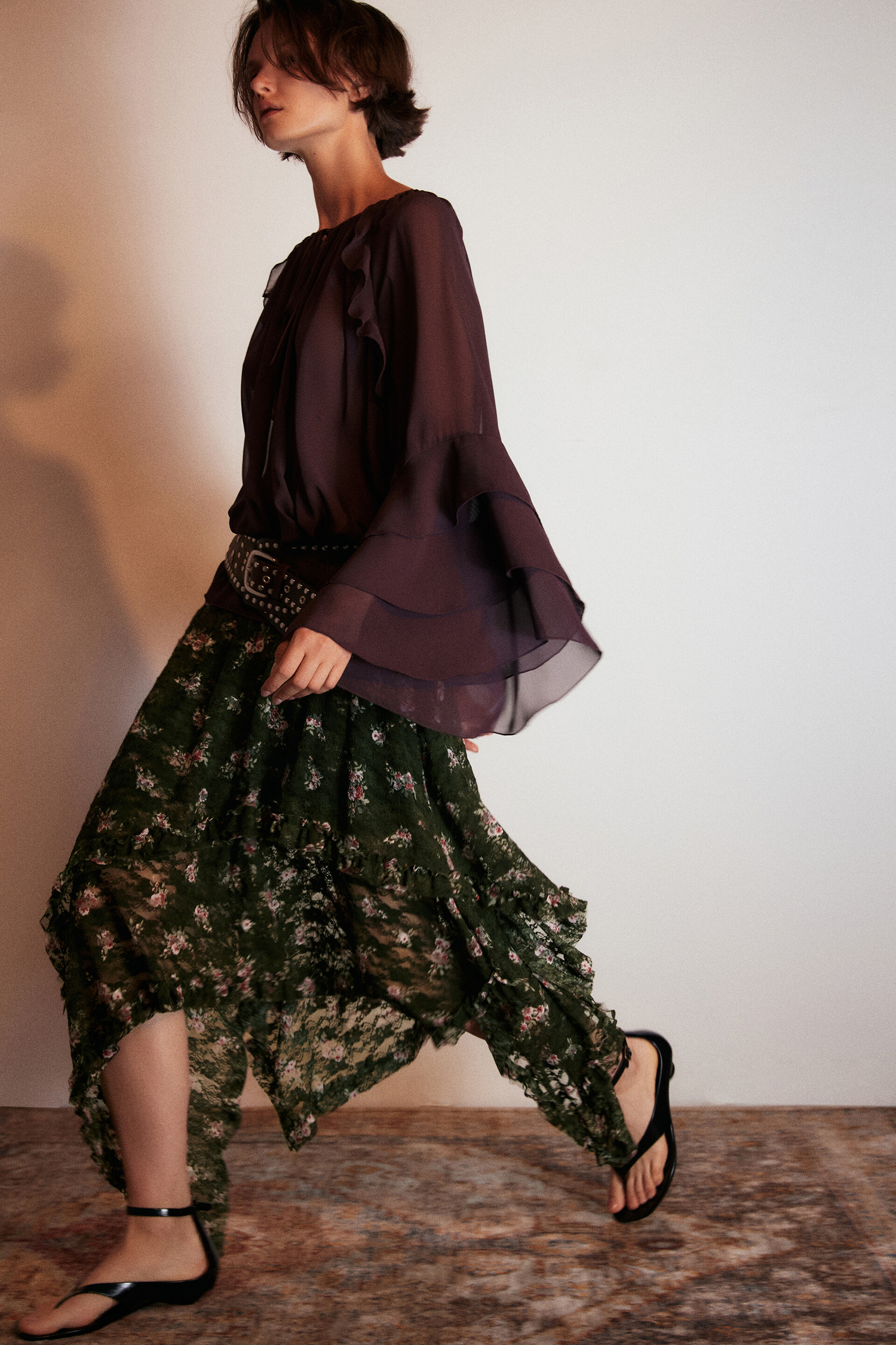 - Асимметричная юбка с цветочным принтом и кружевом станет основой осенних образов. Легкая миди-юбка для ультраженственных аутфитов на каждый день или по особым поводам. Сочетай ее со своим любимым верхом и создавай самые стильные и привлекательные аутфиты, в которых ты гарантированно не останешься без внимания. Сетчатая ткань и кружево придадут легкости и изящества силуэту. Создавай с юбкой луки в трендовом цыганском стиле, надевай ее на свидания или по другим особым поводам, экспериментируй с образами и настроениями каждый день