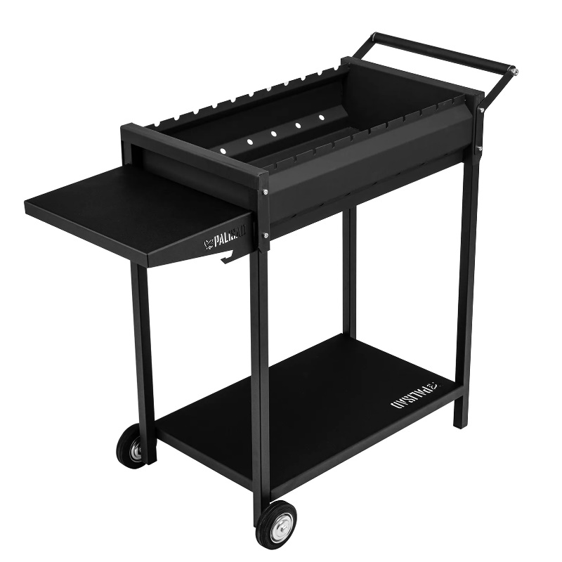 Сварной мангал Palisad Campingразмером 662 х 390 х 152/805 мм, из стали толщиной 2 мм, поставляется в комплекте с кочергой. Служит для приготовления блюд из мяса, рыбы, птицы и овощей на дровах или древесных углях. Позволяет организовать пикник и комфортный отдых на дачном участке.Преимущества Прочность — надежная конструкция из жаропрочной углеродистой стали, усиленная ребрами жесткости, рассчитана на долгий срок службы Долговечность — топка окрашена термостойкой краской, выдерживает нагрев до 700 °C, а на ножки нанесено защитное порошковое покрытие Продуманная конструкция — на боковом столике можно разместить шампуры и другие аксессуары, а на нижней полке — посуду или запас топлива Постоянный приток кислорода — отверстия в корпусе обеспечивают хороший воздухообмен, поэтому раздувать огонь не требуется Комфортное использование — в корпусе предусмотрены прорези, благодаря которым шампуры не скатываются с мангала Удобное перемещение — мангал снабжен ручкой и 2 колесами Расширенная комплектация — мангал поставляется с кочергой, ее не нужно приобретать отдельно