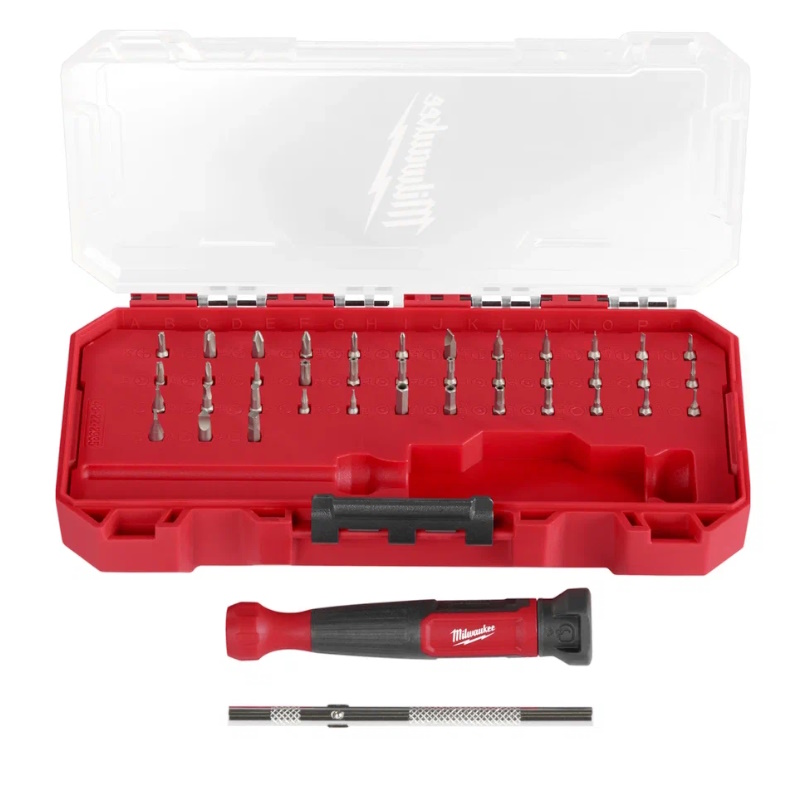 Прецизионная отвертка Milwaukee 39 в 1 () предназначена для выполнения точных и деликатных работ по монтажу и демонтажу крепежных элементовПреимущества Удобная, нескользящая рукоятка для максимального контроля Задняя крышкаможет вращаться на 360°, что обеспечивает лучший контроль над скоростью и точностью Лазерная маркировка размеров биты для облегчения идентификации Хромированный хвостовик для защиты от ржавчины Поставляется в прочной кассете, совместимой с PACKOUT™, из которой можно легко извлечь насадки.