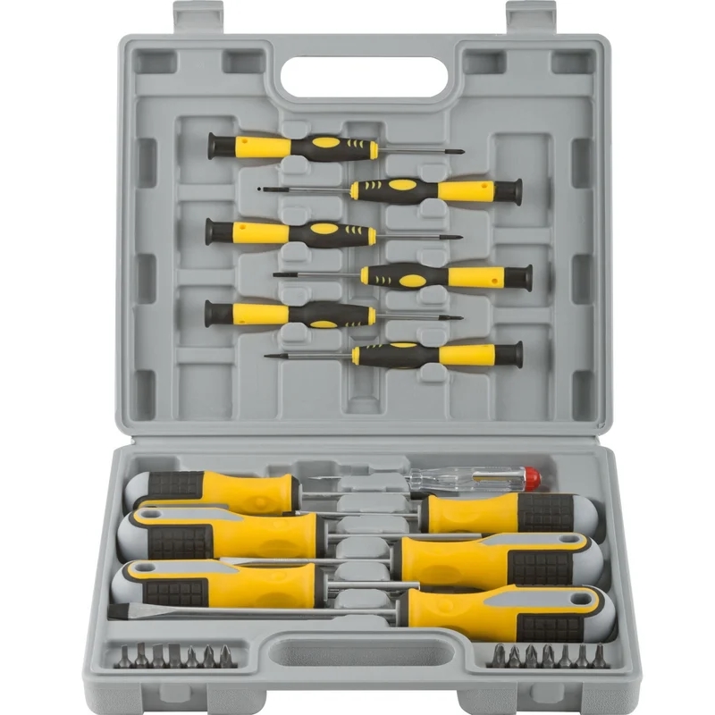 Набор отверток и бит Fit "Старт" 56403 включает 27 предметов и поставляется в удобном пластиковом кейсеПреимущества Материал стержня: CrV (хром-ванадиевая сталь), обеспечивающая прочность и долговечность Количество предметов в наборе: 27 шт Типы наконечников: Phillips (PH), Slotted (SL), Torx (T, Tx) Размеры бит: различные типоразмеры для универсального использования Отвертки для точных работ с размерами SL2.0x50 мм, SL2.5x50 мм и другие Прямая форма ручек отверток для удобства использования Длина стержня отверток: примерно 150 мм Набор подходит для монтажа, ремонта и других работ с крепежом Упаковка: пластиковый кейс для удобного хранения и переноски инструментов