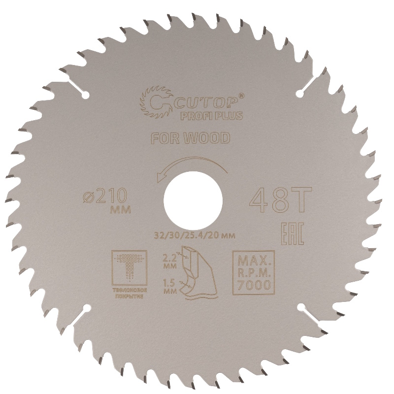Диск пильный по дереву Cutop , с тефлоновым покрытием, 48Т, 210 х 1,5/2,2 х 32/30/25,4/20 мм используется совместно с циркулярными и торцовочными пилами для продольного и поперечного реза. Предназначен для распила мягких и твердых пород древесины, МДФ, фанеры и др. В комплекте поставляются переходные кольца с посадочными диаметрами (диаметры указаны на диске). Упаковка - блистер.Преимущества Диск имеет тефлоновое покрытие и компенсационные пазы, которые способствуют быстрому теплоотводу. Благодаря этому рез получается ровный, а диск не деформируется и имеет более длительный срок службы Изготавливаются диски в специальной автоматической индукционной машине, которая обеспечивает более гладкую поверхность и острые зубья Материал - инструментальная сталь, карбидные зубья