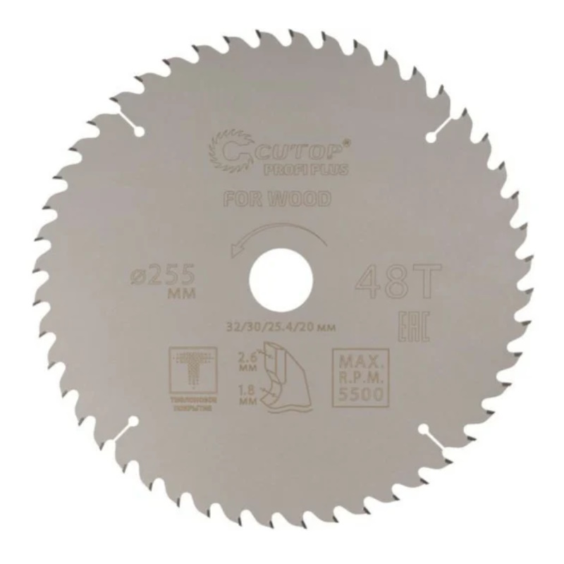 Диск пильный по дереву Cutop , с тефлоновым покрытием, 48Т, Profi plus, 255 х 1,8/2,6 х 32/30/25,4/20 мм 75-25548Т