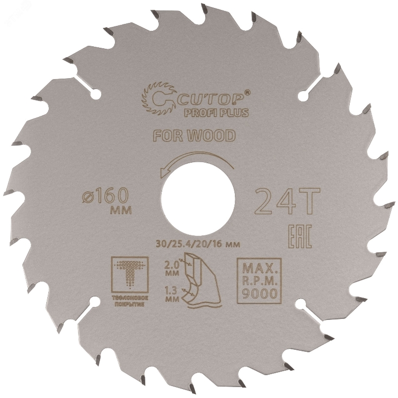 Диск пильный по дереву Cutop , с тефлоновым покрытием 24Т, Profi plus 160 х 1,3/2,0 х 30/25,4/20/16 мм 75-16024Т