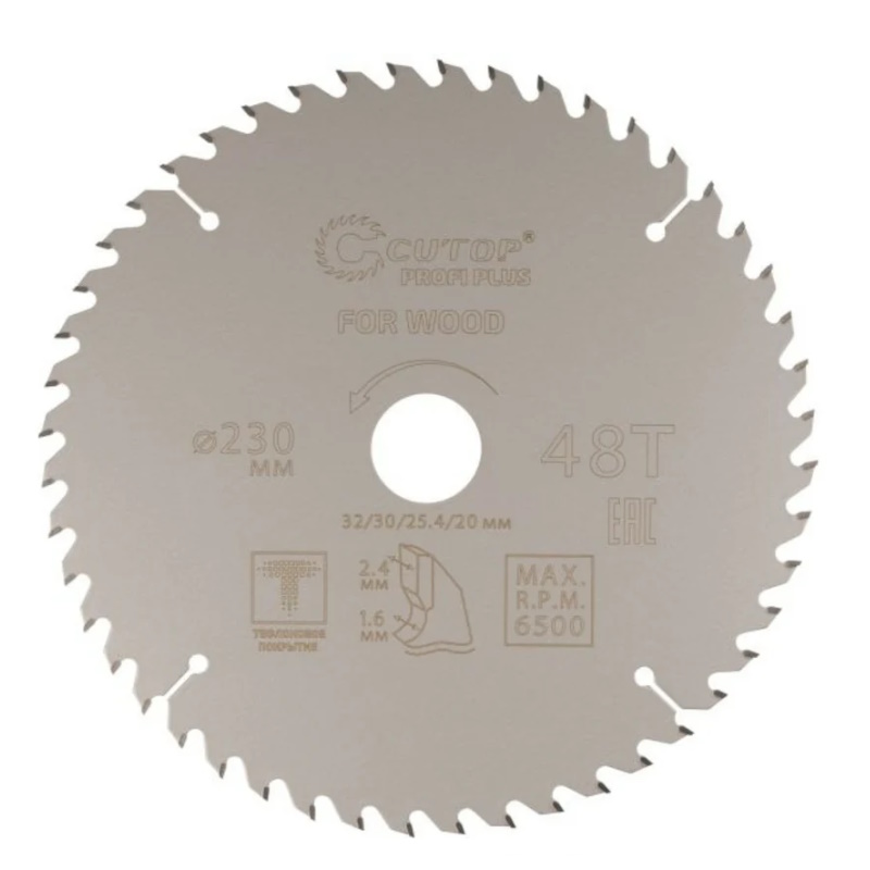 Диск пильный по дереву Cutop , с тефлоновым покрытием, 48Т, Profi plus, 230 х 1,6/2,4 х 32/30/25,4/20 мм 75-23048Т