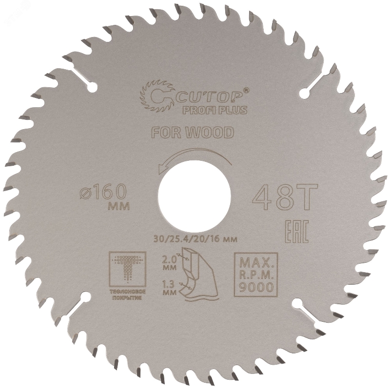 Диск пильный по дереву Cutop с тефлоновым покрытием 48Т, Profi plus 160 х 1,3/2,0 х 30/25,4/20/16 мм 75-16048Т