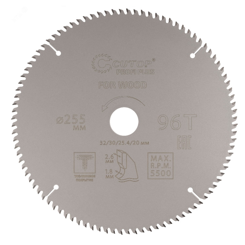 Диск пильный по дереву с тефлоновым покрытием Cutop , 96Т, Profi plus, 255 х 1,8/2,6 х 32/30/25,4/20 мм 75-25596Т
