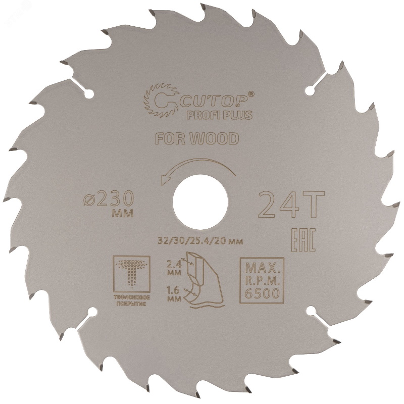 Диск пильный по дереву с тефлоновым покрытием Cutop , 24Т, Profi plus, 230 х 1,6/2,4 х 32/30/25,4/20 75-23024Т