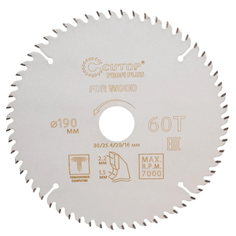 Диск пильный по дереву с тефлоновым покрытием Cutop , 60Т, Profi plus, 190 х 1,5/2,2 х 30/25,4/20/16 мм 75-19060Т
