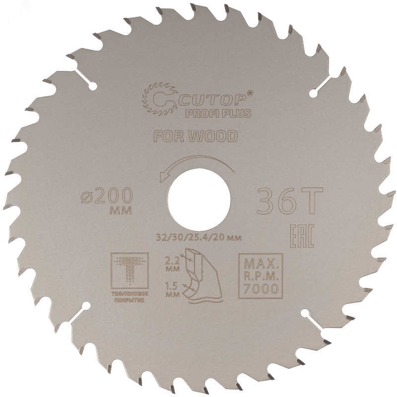 Диск пильный по дереву Cutop с тефлоновым покрытием 36Т, Profi plus, 200 х 1,5/2,2 х 32/30/25,4/20 мм 75-20036Т