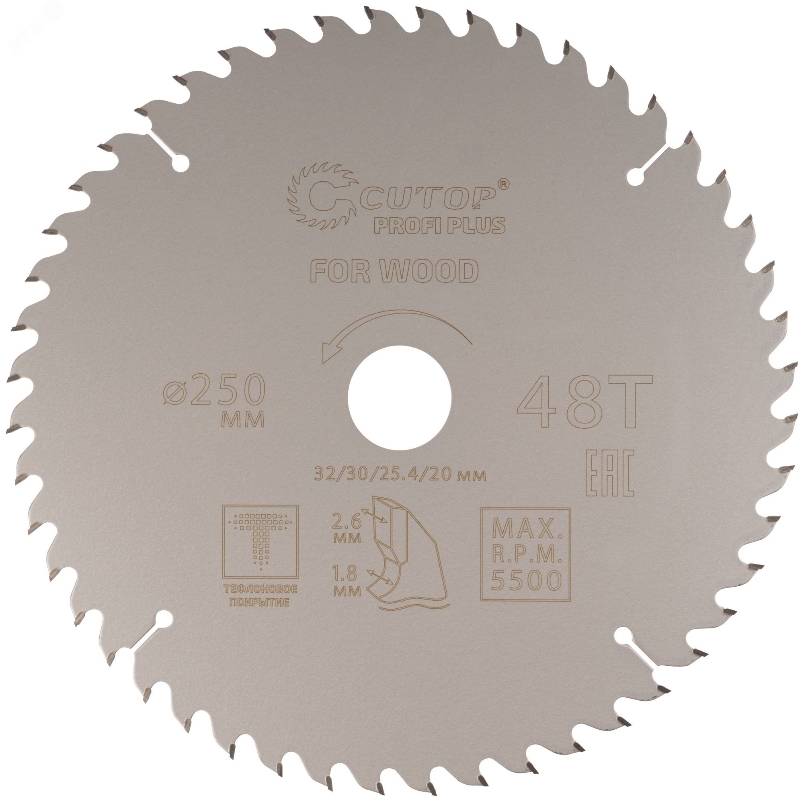 Диск пильный по дереву с тефлоновым покрытием Cutop , 48Т, Profi plus, 250 х 1,8/2,6 х 32/30/25,4/20 мм 75-25048Т