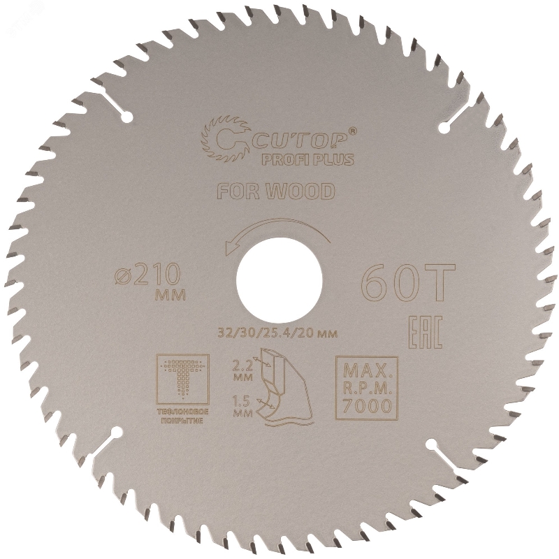 Диск пильный по дереву с тефлоновым покрытием Cutop , 60Т, Profi plus, 210 х 1,5/2,2 х 32/30/25,4/20 мм 75-21060Т
