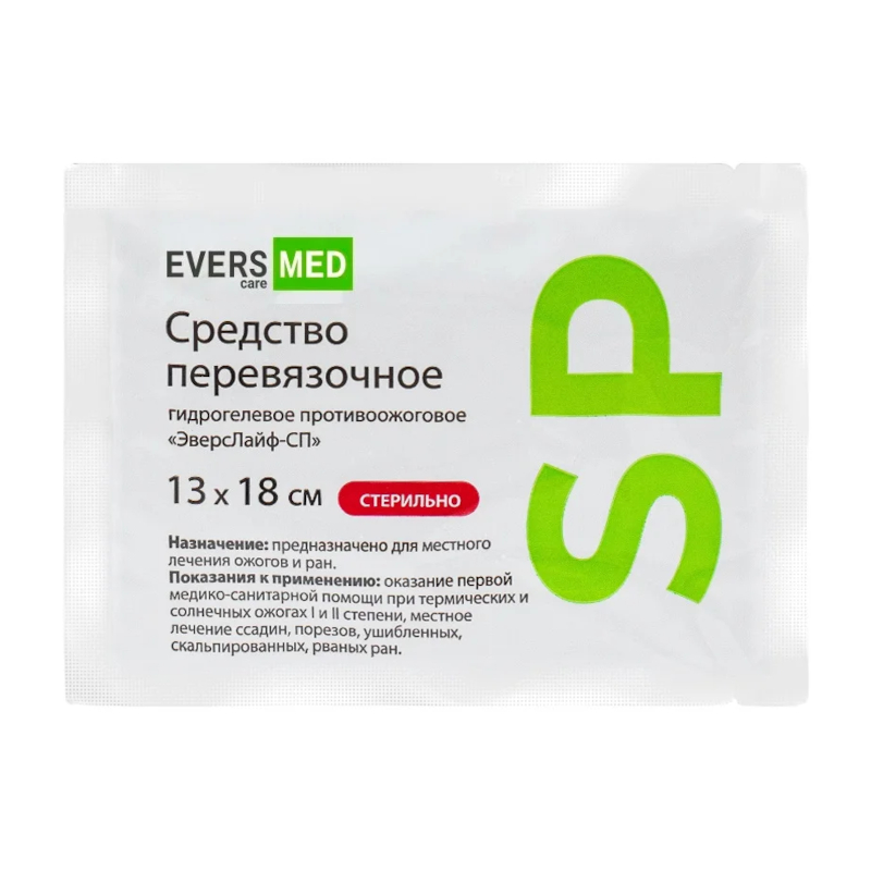 Средство перевязочное гидрогелевое противоожоговое «ЭверсЛайф-СП», стерильное», представляет собой салфетку из нетканого материала, пропитанную гидрогелем низкой вязкости на основе хитозана. Предназначено для оказания первой и первичной медико-санитарной помощи при термических и солнечных ожогах I и II степени, местного лечения ссадин, порезов, ушибленных, рваных, иссеченных и скальпированных ран.