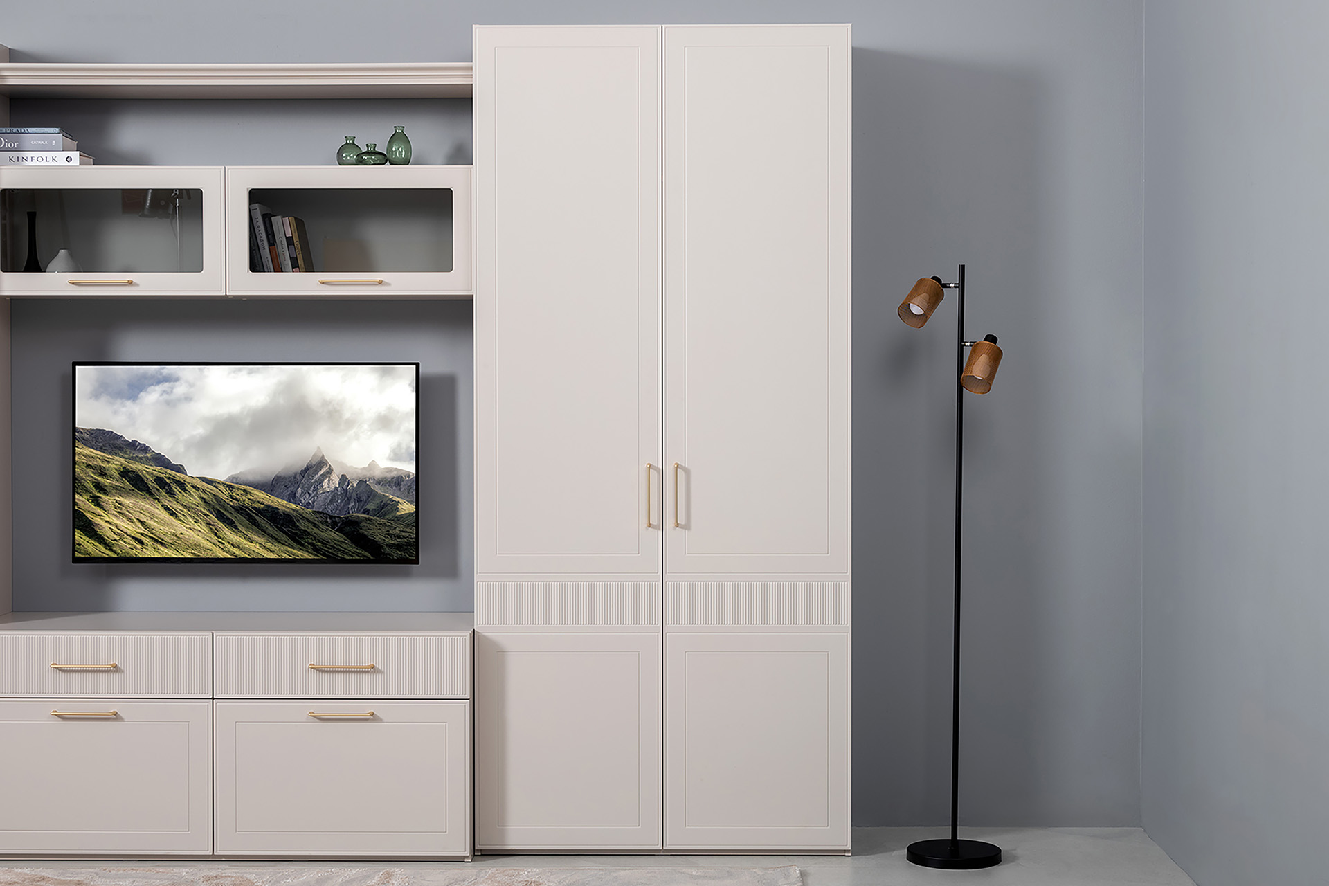 Коллекция «Ричфорд» — это современная классика с акцентом на удобство и стиль.Фрезерованные фасады из МДФ, металлические ручки и витрины с тонированным стеклом создают изысканный образ.Петли с доводчиками, полное выдвижение ящиков, выдвижная штанга в шкафу для одежды и съемные полки делают использование максимально комфортным.Для более завершенного образа, к шкафам можно дополнительно приобрести карнизы.
