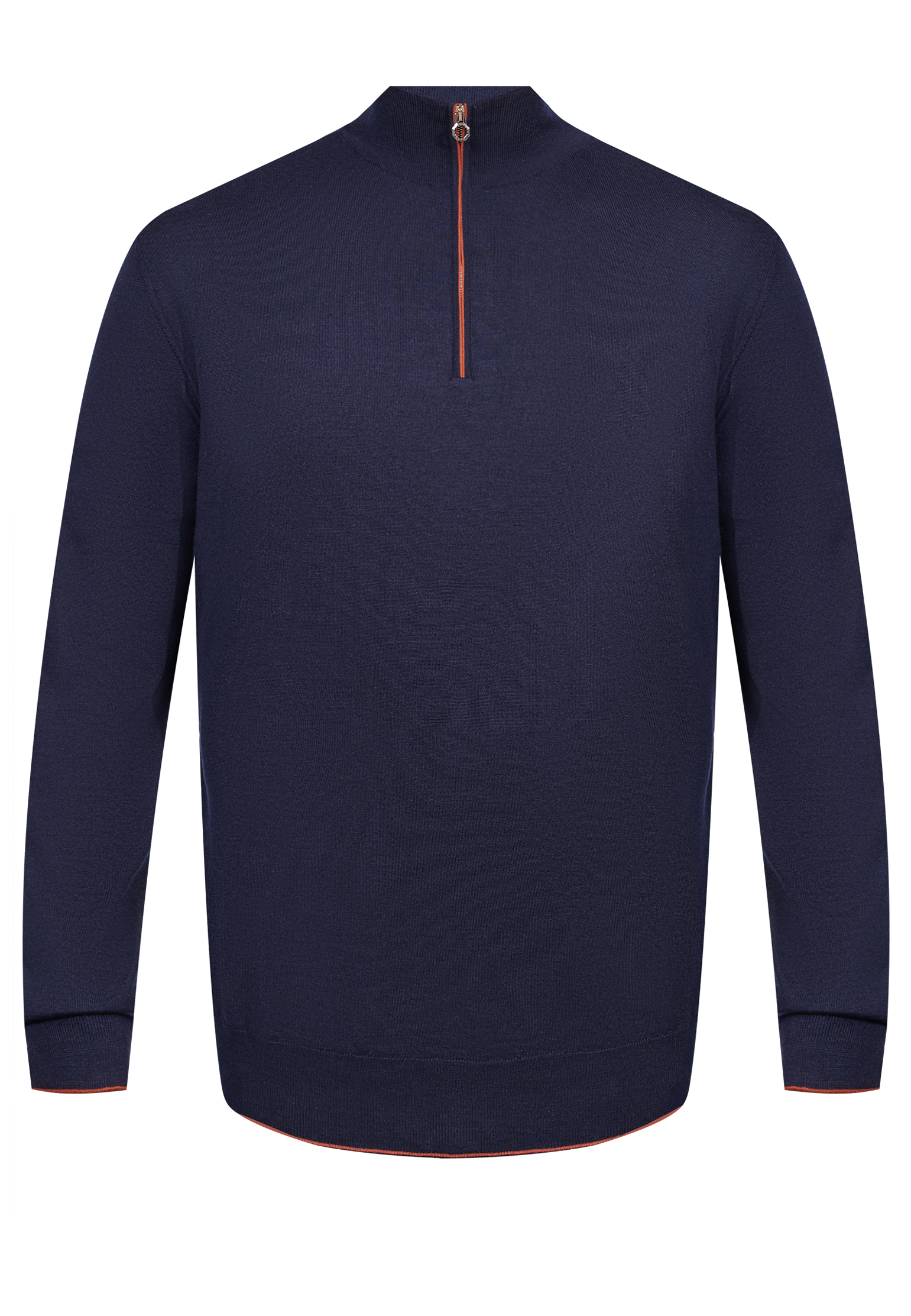 Темно-синий пуловер из шерсти, шелка и кашемира от Stefano Ricci представляет собой гармоничное сочетание роскоши и комфорта. Это элегантное поло с длинными рукавами отличается высоким качеством материалов, обеспечивающих мягкость и тепло. Дизайн пуловера дополнен молнией, что позволяет регулировать степень открытости горловины, добавляя элемент практичности и стиля. Узкие контрастные полосы красного цвета украшают изделие, придавая ему динамичный и современный вид. Эти элементы отлично сочетаются с вышитой монограммой Stefano Ricci, расположенной на эластичном поясе, что подчеркивает престиж бренда и внимание к деталям. Изделие станет идеальным выбором для тех, кто ценит изысканность и индивидуальный стиль. Оно легко впишется в разнообразные образы, будь то деловой или casual стиль, и подчеркнет вашу уверенность и утонченный вкус.