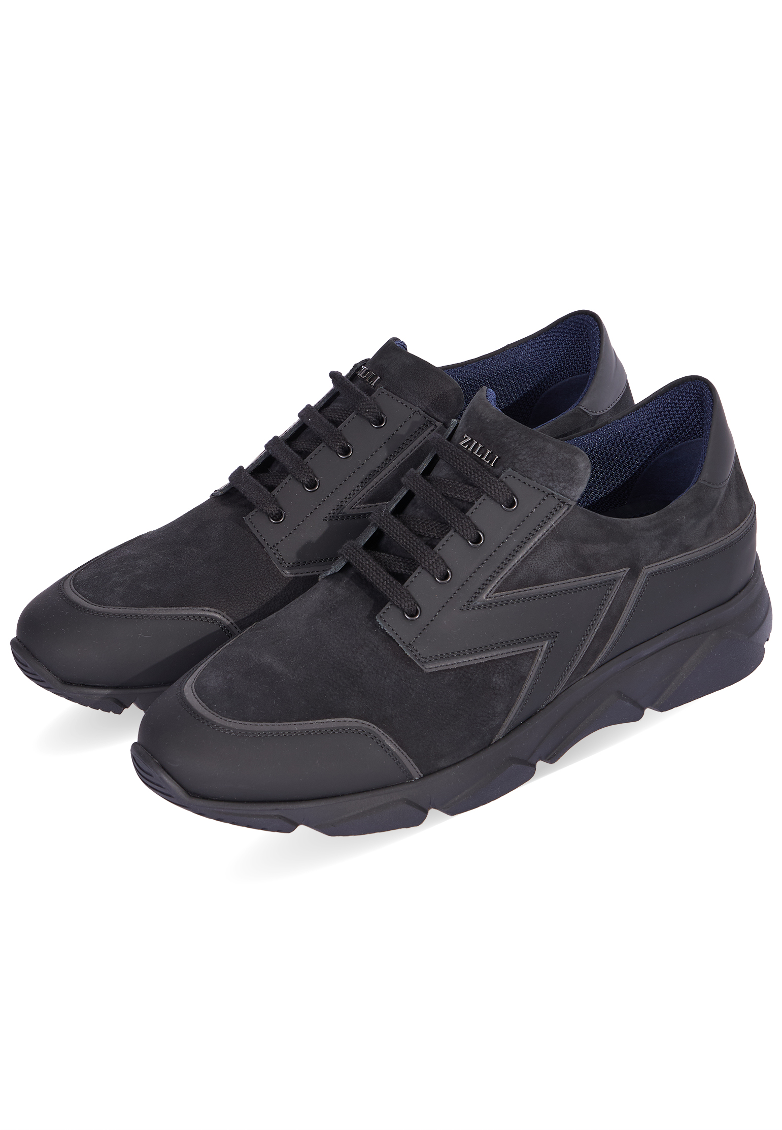 Черные кроссовки Zilli из зернистого нубука отличаются стильным дизайном и высоким качеством материалов. Их укрепили гладкими резиновыми накладками, которые не только добавляют прочности, но и визуально украшают модель, формируя боковые элементы в виде фирменной литеры Z. Этот акцент привлекает внимание и подчеркивает принадлежность бренду. Язычок украшен небольшим металлическим логотипом марки, добавляя имиджевый штрих к общему виду. Обувь оснащена полимерной подошвой в тон, сочетающей в себе легкость и долговечность. Трикотажный подклад обеспечивает комфортную посадку на ноге, а кожаная стелька добавляет дополнительный комфорт и износостойкость. Изогнутая форма подошвы адаптируется к каждому шагу, улучшая амортизацию и создавая ощущение легкости и естественности движений.
