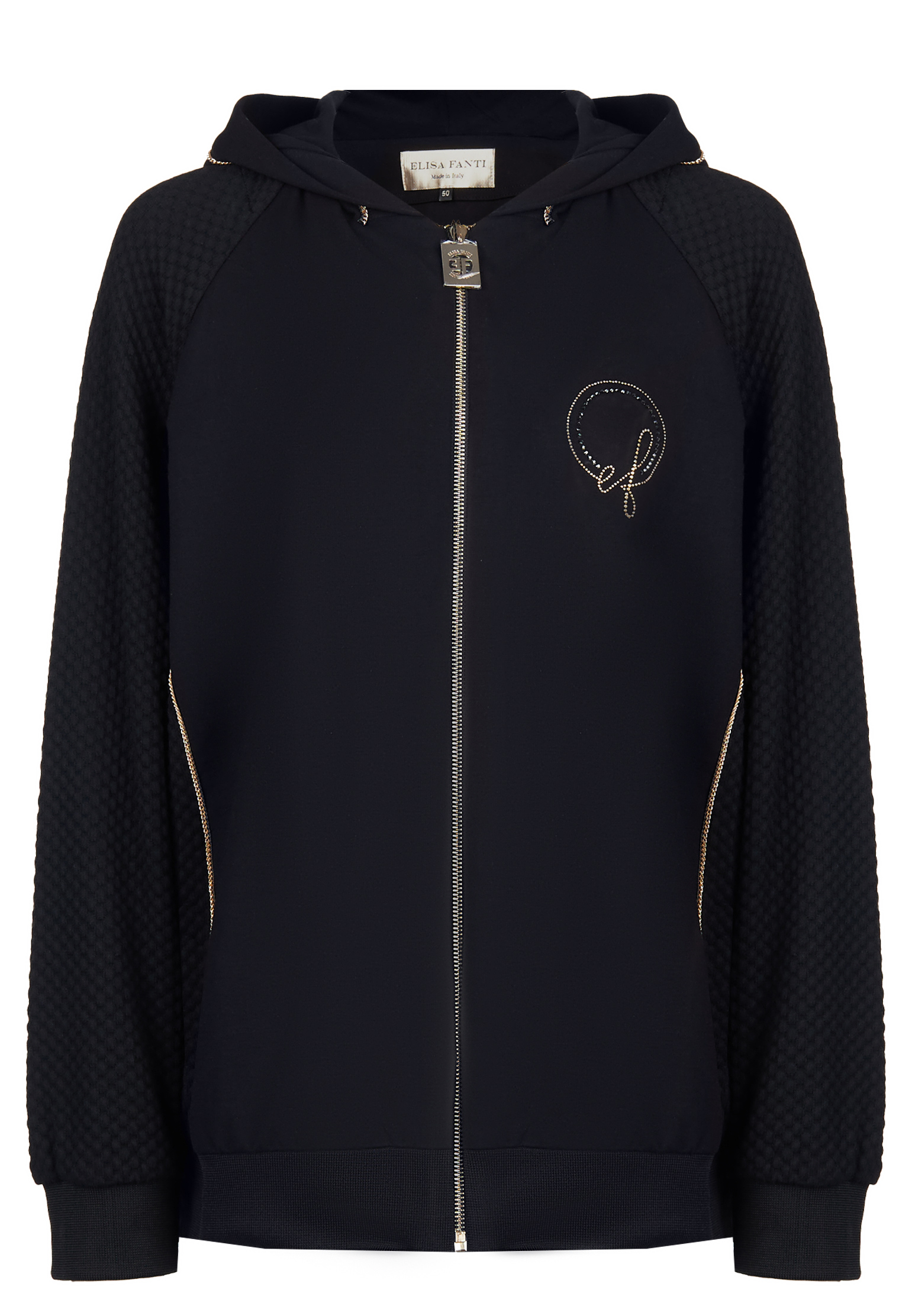 Эта женская толстовка от Elisa Fanti изготовлена из мягкого трикотажа punto milano, который обеспечивает комфорт и долговечность. Особенное внимание привлекают рельефные швы и края капюшона, украшенные декоративными золотыми цепочками. Такое оригинальное решение добавляет изделию изысканности и шарма, делая его заметным акцентом в вашем гардеробе. Вышитый стразами логотип бренда на груди придает толстовке эксклюзивность и подчеркивает вашу приверженность к высоким стандартам стиля. Модель отлично подходит для создания образа в стиле спорт-шик и для повседневных комплектов. Для завершения костюма рекомендуем дополнить её брюками из той же коллекции, что позволит вам выглядеть стильно и ощущать комфорт в любой ситуации.