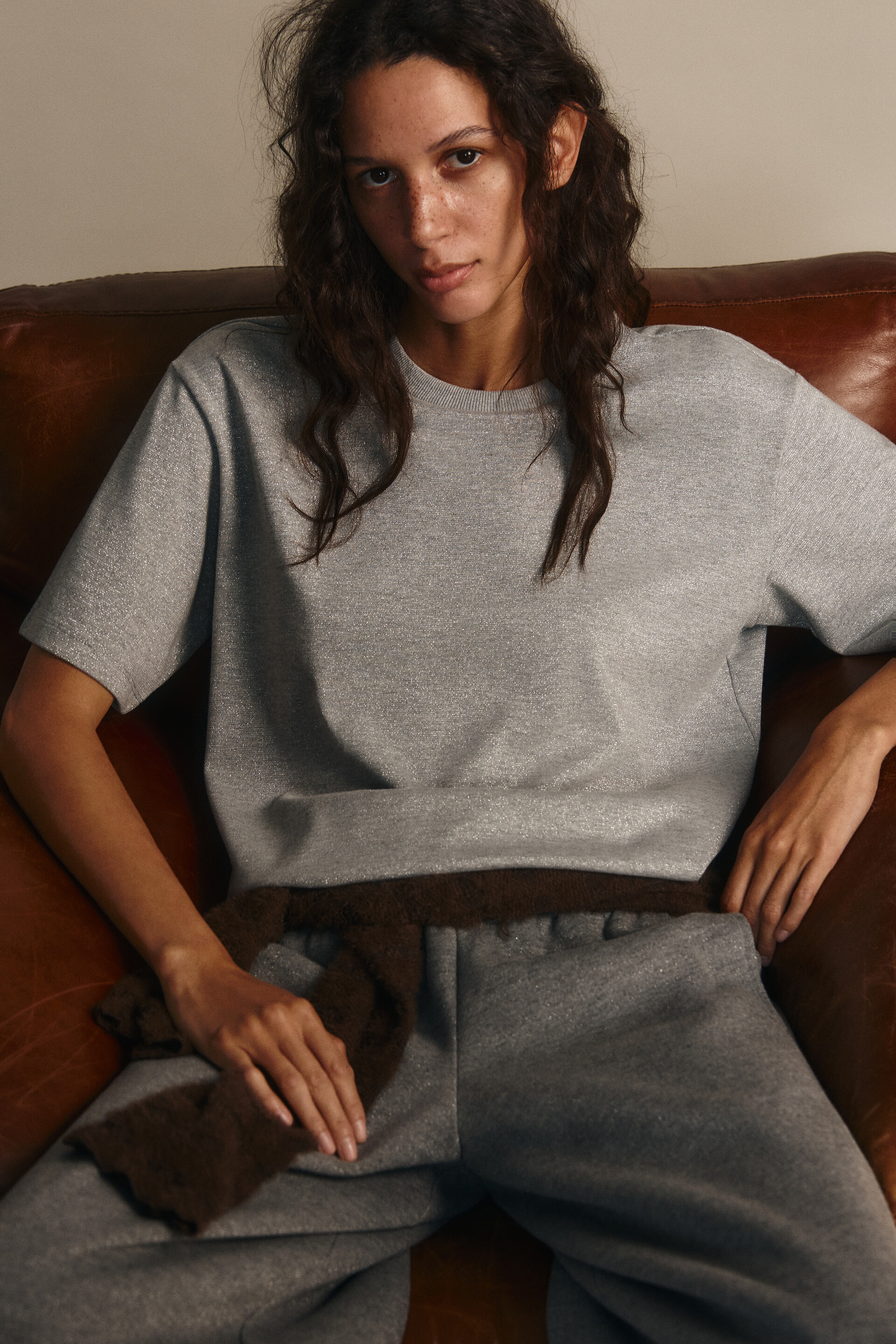 - Женская футболка свободного кроя из плотной ткани с люрексом