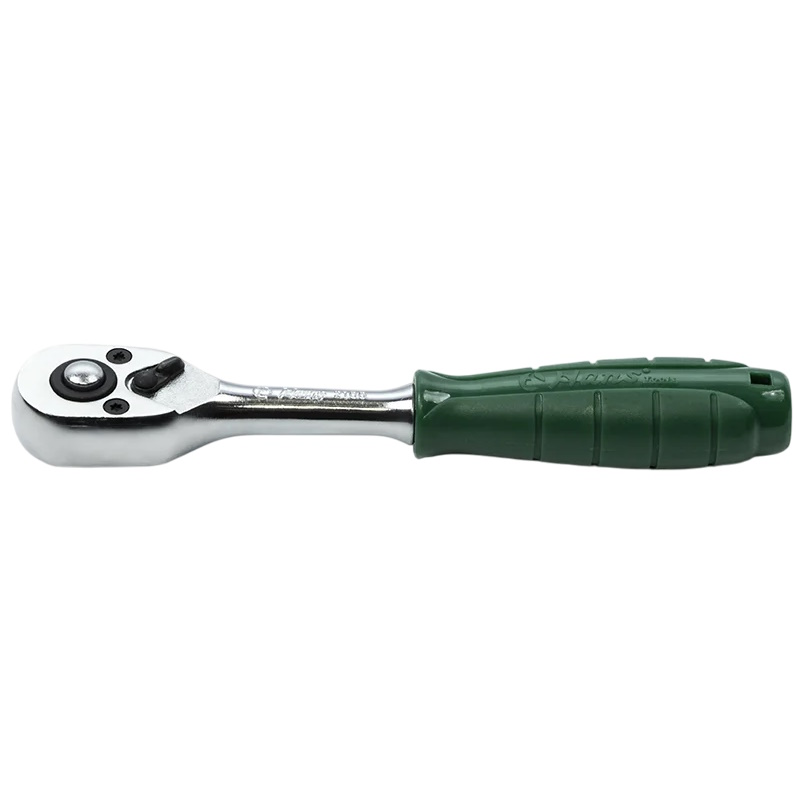 Трещотка с быстрым сбросом Hans 2100GQ, 1/4" – это ключ, состоящий из 2 частей: откручивающая головка с храповым механизмом и рукоятка. Предназначена для использования с торцевыми головками, головками со вставками, битами (через адаптер).Преимущества Трещотка изготовлена из закаленной хром-ванадиевой стали, устойчивой к механическим нагрузкам Технология изготовления включает в себя метод горячей ковки с последующей термообработкой, что придаёт особую прочность, высокую надёжность, - все те качества, соответствующие требованиям стандартов DIN 3122- ISO 3315 Хромированное покрытие защищает от коррозии Трещотка с храповым механизмом отличается простотой и удобством в применении Трещоточный механизм ключа позволит работать им, не отрывая от закручиваемой детали Резиновая накладка на ручке не позволяет инструменту скользить Имеет флажок реверса и кнопку быстрого сброса