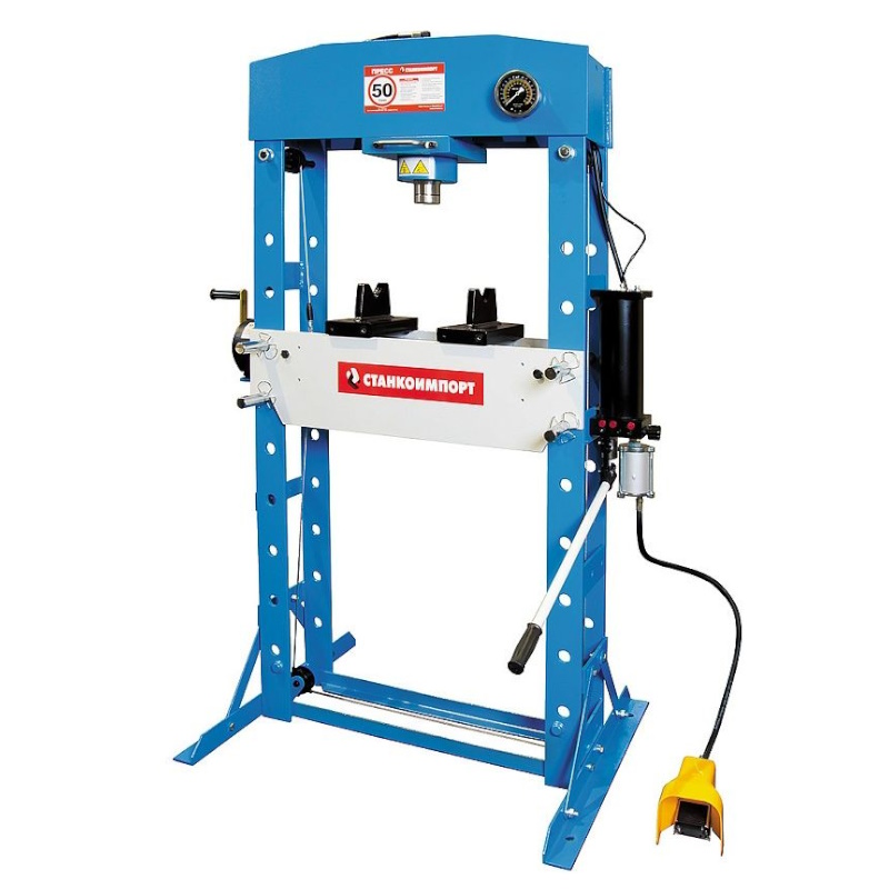 Пневмо-гидравлический пресс Станкоимпорт SD0811CE, на 50 тонн предназначен для запрессовки или выпрессовки втулок, коленвала, снятия или установки подшипников для автомобиля, сжатия всевозможных деталей, для гибки арматуры или листового металла.Преимущества Подвижной цилиндр Комбинированный привод Управление пневматическим насосом за счет педали Ручной гидравлический насос имеет две скорости Лебедка для перемещения рабочего стала Устойчивость манометра к колебаниям давления за счет наполнения компенсирующей жидкостью Сварная рама пресса увеличивает срок службы