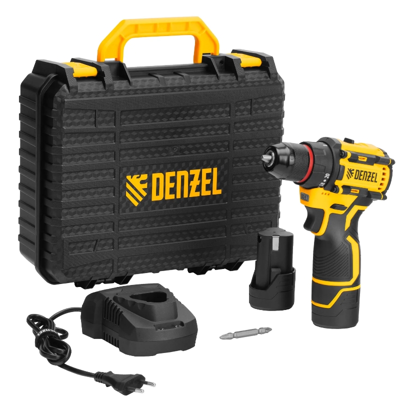 Аккумуляторная дрель-шуруповерт Denzel CDH-BL-12 26108 используется для закручивания и откручивания резьбового крепежа, а также для сверления отверстий в древесине, металле, пластмассе и других материалах. Максимальный диаметр сверления в металле составляет 10 мм, в древесине — 25 мм. Работает от аккумулятора Li-Ion 12 В емкостью 2 А·ч. Мощный бесщеточный двигатель позволяет развивать крутящий момент до 45 Н·м для эффективного применения в бытуПреимущества Быстрая подготовка к работе — благодаря бесключевому патрону в сочетании с функцией блокировки шпинделя установка и замена оснастки не занимает много времени 2 режима — частота вращения шпинделя плавно регулируется в диапазоне 0-450 об/мин для работы с резьбовым крепежом и 0-1800 об/мин для сверления Точная настройка усилия затяжки — предусмотрена 20+1 ступень регулировки крутящего момента Тормоз свободного выбега — вращение шпинделя прекращается сразу после отключения двигателя, что упрощает работу и позволяет избежать перетяжки крепежа Хорошая освещенность — светодиодная подсветка включается одновременно с запуском двигателя Удобная работа — реверс позволяет мгновенно менять направление вращения при необходимости откручивания крепежа или извлечения заклинившего сверла Индикация заряда батареи — можно вовремя произвести подзарядку или заменить аккумулятор, чтобы не прерывать работу надолго Эргономичность — инструмент отличается компактностью, прорезиненная рукоятка надежно ложится в руку и снижает вибрации во время работы Расширенная комплектация — дрель-шуруповерт поставляется с 2 аккумуляторами, зарядным устройством и битой Надежная упаковка — дрель-шуруповерт с аксессуарами поставляется в прочном пластиковом кейсе