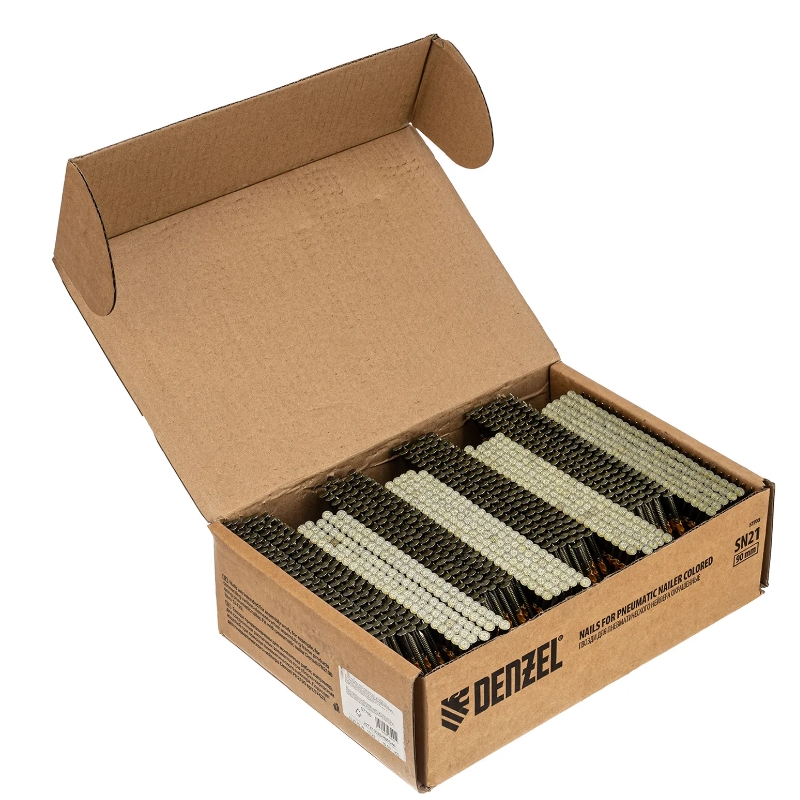 Гвозди Denzel 57700 типа SN21, длиной 90 мм и диаметром 3,05 мм, с крашеной поверхностью, 2000 шт. в упаковке, — расходники для пневматического нейлера. Используются для скрепления различных материалов, будут полезны во время сборочных и отделочных работПреимущества Прочность — крепежные элементы изготовлены из стали Надежное и долговечное соединение — гвозди не гнутся, рифленая рабочая часть исключает их самопроизвольный выход из своих гнезд Удобная комплектация — запаса из 2000 шт. хватит для выполнения большого объема работ