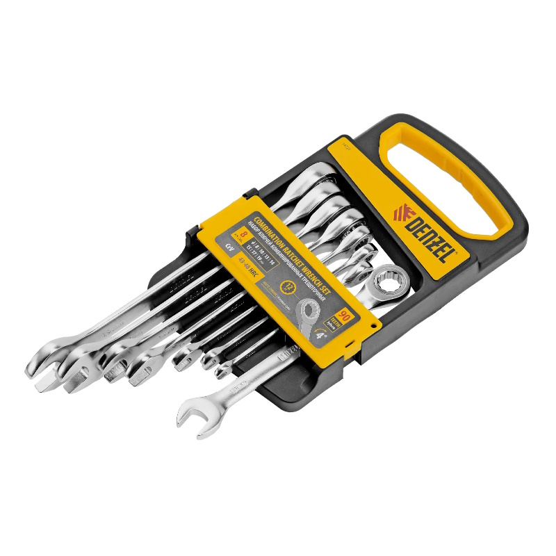 Набор комбинированных трещоточных ключей Denzel 14721 состоит из 8 инструментов из стали CrV, размером 6-19 мм, с покрытием «матовый хром». Используется для проведения монтажных и демонтажных работ с резьбовыми соединениями, в том числе в труднодоступных местах. У каждого ключа 2 рабочих профиля, что расширяет возможности использования набора. Инструменты пригодятся дома и в гараже.Преимущества Прочность и долговечность — ключи изготовлены из хромованадиевой стали, матовое хромовое покрытие защищает их от повреждений и коррозии Износостойкость — твердость рабочих частей составляет 43-48 HRC, поэтому они не деформируются при работе со значительным усилием Аккуратная работа — 12-гранная накидная часть увеличивает площадь соприкосновения с головкой крепежа и снижает риск ее деформации Комфортная эксплуатация — храповой механизм с 90 зубьями обеспечивает максимально плавный ход, шаг трещотки составляет 4°
