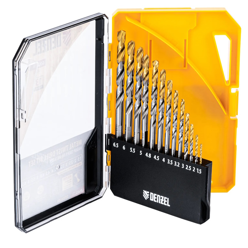 Набор сверл по металлу Denzel 723002, 1,5-6,5мм, Р6М5-TiN, Golden Tip, 13 шт.