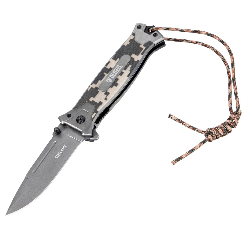 Нож складной, многоцелевой Denzel 79208, системы Liner-Lock, с накладкой G10, на прямой рукоятке+стеклобой находит широкое применение при активном отдыхе на природе, во время рыбалки и охоты. Флиппер помогает быстро раскрывать нож. Также нож оснащен стеклобоем, которым можно разбить стекло в аварийной ситуации.Преимущества Система Liner-Lock — такой тип замка позволяет раскрывать и закрывать нож одной рукой Высокий ресурс и коррозионная стойкость — лезвие ножа выполнено из стали 440C твердостью 56-58 HRC с покрытием TiCN Безопасная эксплуатация — рукоятка с многослойной накладкой G10 из стеклотекстолита предотвращают соскальзывание руки на лезвие Удобная транспортировка — нож оснащен стальной клипсой для фиксации на ремне