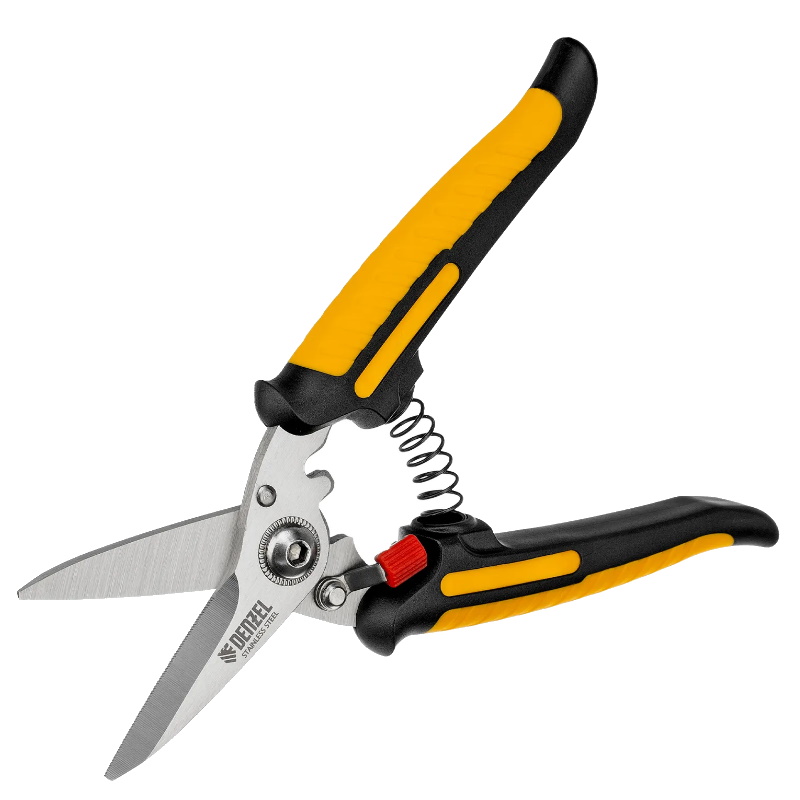 Ножницы универсальные Denzel 78318, 185 мм, нержавеющая сталь - инструмент для разрезания тонкого металла и мягких материалов. Одно из лезвий имеет серрейторную (зубчатую) заточку, поэтому разрезаемый материал не выскальзывает из инструмента. Ножницы подходят для выполнения разнообразных работ: на даче помогут разрезать стальную сетку с небольшим диаметром проволоки, в походе — ветки или рыбу, во время мелкого ремонта или занятий творчеством — провода, кожу, резину, картон, бумажную лозу и другие материалы.Преимущества Прочность и долговечность — лезвия из нержавеющей стали долго сохраняют рабочие свойства и не подвержены образованию коррозии Контроль качества реза — при помощи шестигранного винта HEX 4 можно регулировать зазор между лезвиями Авторазжим — благодаря возвратной пружине достаточно расслабить руку для раскрытия ножниц во время резки Комфортная работа — пластиковые двухкомпонентные рукоятки с упором для пальцев обеспечивают надежный хват и не выскальзывают из руки Безопасность — замок-фиксатор удерживает лезвия сомкнутыми при хранении и транспортировке инструмента