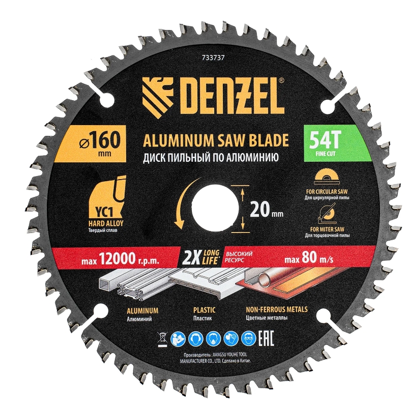 Пильный диск Denzel 733737 диаметром 160 x 20 мм, с 54 зубьями, предназначен для точного распиливания заготовок из алюминия, пластика, цветных металлов. Устанавливается на циркулярную или торцовочную пилу, поддерживающую максимальную частоту вращения 12000 об/мин, также возможно использование с распиловочным станком. Зубья трапециевидно-плоского типа (TCG) с отрицательным углом заточки обеспечивают ровный рез без сколов. В комплект поставки входит переходное кольцо 20/16 мм, позволяющее изменить посадочный диаметр при необходимостиПреимущества Надежность — термически обработанная основа из пружинной стали 65Mn выдерживает высокие динамические нагрузки без риска деформации Эффективность — режущая часть из твердого сплава YC1, прошедшая многоступенчатую заточку, позволяет успешно справляться с прочными материалами Высокое качество реза — компенсационные прорези снижают вибрации, рабочая часть с мелкими зубьями обеспечивает получение чистой кромки без заусенцев Прочность — твердосплавные пластины надежно зафиксированы при помощи термостойкого припоя с повышенным содержанием серебра Коррозионная стойкость — покрытый защитным лаком корпус и никелированное переходное кольцо устойчивы к разрушению