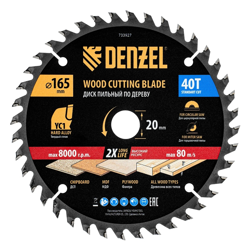 Пильный диск Denzel 733927 диаметром 165 x 20 мм, с 40 зубьями типа ATB, предназначен для продольного и поперечного распиливания древесины всех типов, в том числе с гвоздями и остатками бетона, а также ДСП, МДФ, фанеры. Режущие пластины из твердого сплава YC1, прошедшие многоступенчатую заточку, позволяют успешно справляться с прочными материалами. Диск устанавливается на циркулярную, торцовочную пилу или на распиловочный станок. В комплект поставки входит переходное кольцо 20/16 мм, позволяющее изменить посадочный диаметр при необходимостиПреимущества Надежность — основа из пружинной стали 65Mn устойчива к повреждению Высокие эксплуатационные свойства — твердосплавные пластины надежно закреплены при помощи высококачественного припоя, режущая часть выдерживает значительные нагрузки Оптимальное соотношение скорости и качества пиления — рабочая часть с 40 зубьями обеспечивает быстрый и ровный рез Продуманная конструкция — благодаря компенсационным прорезям снижаются вибрации, диск не деформируется во время работы, что повышает качество работы Долговечность — лакированный корпус и никелированное переходное кольцо устойчивы к коррозии, что продлевает срок службы оснастки