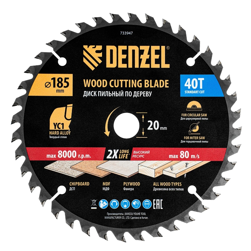 Пильный диск Denzel 733947 диаметром 185 x 20 мм, с 40 зубьями типа ATB, предназначен для продольного и поперечного распиливания древесины всех типов, в том числе с гвоздями и остатками бетона, а также ДСП, МДФ, фанеры. Тип реза — стандартный. Режущие пластины из твердого сплава YC1, прошедшие многоступенчатую заточку, позволяют успешно справляться с прочными материалами. Диск устанавливается на циркулярную, торцовочную пилу или на распиловочный станок. В комплект поставки входит переходное кольцо 20/16 мм, позволяющее изменить посадочный диаметр при необходимостиПреимущества Надежность — основа из пружинной стали 65Mn устойчива к повреждению Высокие эксплуатационные свойства — твердосплавные пластины надежно закреплены при помощи высококачественного припоя, режущая часть выдерживает значительные нагрузки Оптимальное соотношение скорости и качества пиления — рабочая часть с 40 зубьями обеспечивает быстрый и ровный рез Продуманная конструкция — благодаря компенсационным прорезям снижаются вибрации, диск не деформируется во время работы, что повышает качество работы Долговечность — лакированный корпус и никелированное переходное кольцо устойчивы к коррозии, что продлевает срок службы оснастки