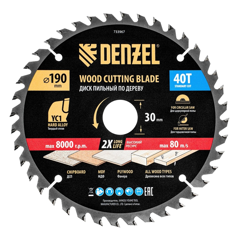 Пильный диск Denzel 733967 диаметром 190 x 30 мм, с 40 зубьями типа ATB, предназначен для продольного и поперечного распиливания древесины всех типов, в том числе с гвоздями и остатками бетона, а также ДСП, МДФ, фанеры. Тип реза — стандартный. Режущие пластины из твердого сплава YC1, прошедшие многоступенчатую заточку, позволяют успешно справляться с прочными материалами. Диск устанавливается на циркулярную, торцовочную пилу или на распиловочный станок. В комплект поставки входит переходное кольцо 30/20 мм, позволяющее изменить посадочный диаметр при необходимостиПреимущества Надежность — основа из пружинной стали 65Mn устойчива к повреждению Высокие эксплуатационные свойства — твердосплавные пластины надежно закреплены при помощи высококачественного припоя, режущая часть выдерживает значительные нагрузки Оптимальное соотношение скорости и качества пиления — рабочая часть с 40 зубьями обеспечивает быстрый и ровный рез Продуманная конструкция — благодаря компенсационным прорезям снижаются вибрации, диск не деформируется во время работы, что повышает качество работы Долговечность — лакированный корпус и никелированное переходное кольцо устойчивы к коррозии, что продлевает срок службы оснастки