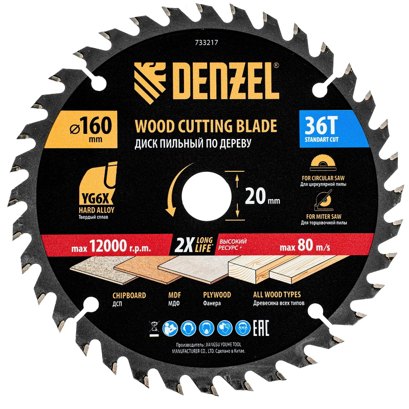 Пильный диск Denzel 733217 диаметром 160 x 20 мм, с 36 зубьями, предназначен для продольного и поперечного распила твердой и мягкой древесины, фанеры, МДФ, ДСП. 36 зубьев типа ATB с режущими пластинами оптимальной геометрии обеспечивают качественный рез. Тип реза — стандартный. Режущие пластины из твердого сплава YG6X сохраняют рабочие свойства при интенсивном использовании. Диск устанавливается на циркулярную, торцовочную пилу или на распиловочный станок. В комплект поставки входит переходное кольцо с 20 на 16 мм, что позволяет изменить посадочный размер и расширяет возможности использования диска.Преимущества Надежность — режущие пластины крепко зафиксированы методом пайки с использованием высококачественного термостойкого припоя, содержащего повышенное количество серебра Долговечность — корпус изготовлен из пружинной стали 65Mn и прошел термическую обработку, поэтому выдерживает повышенные нагрузки Высокое качество выполняемых работ — благодаря компенсационным прорезям диск не деформируется при нагрузках, обеспечивая стабильно ровный рез Защита от разрушения — корпус покрыт лаком, переходное кольцо никелировано для предотвращения образования коррозии