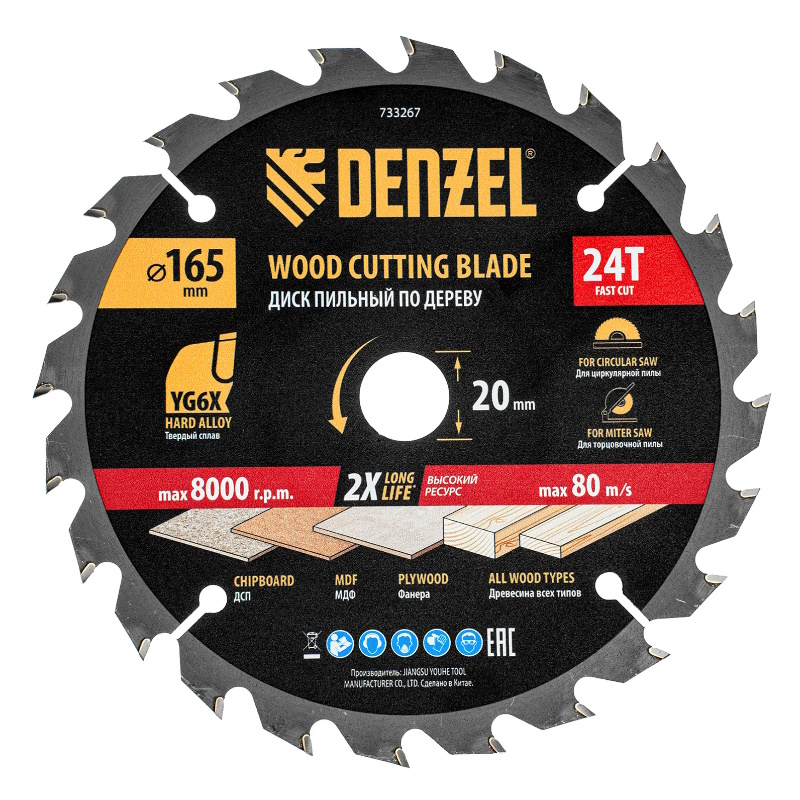 Пильный диск по дереву Denzel 733267, ф165 х 20 мм, 24 зубьев, тонкий