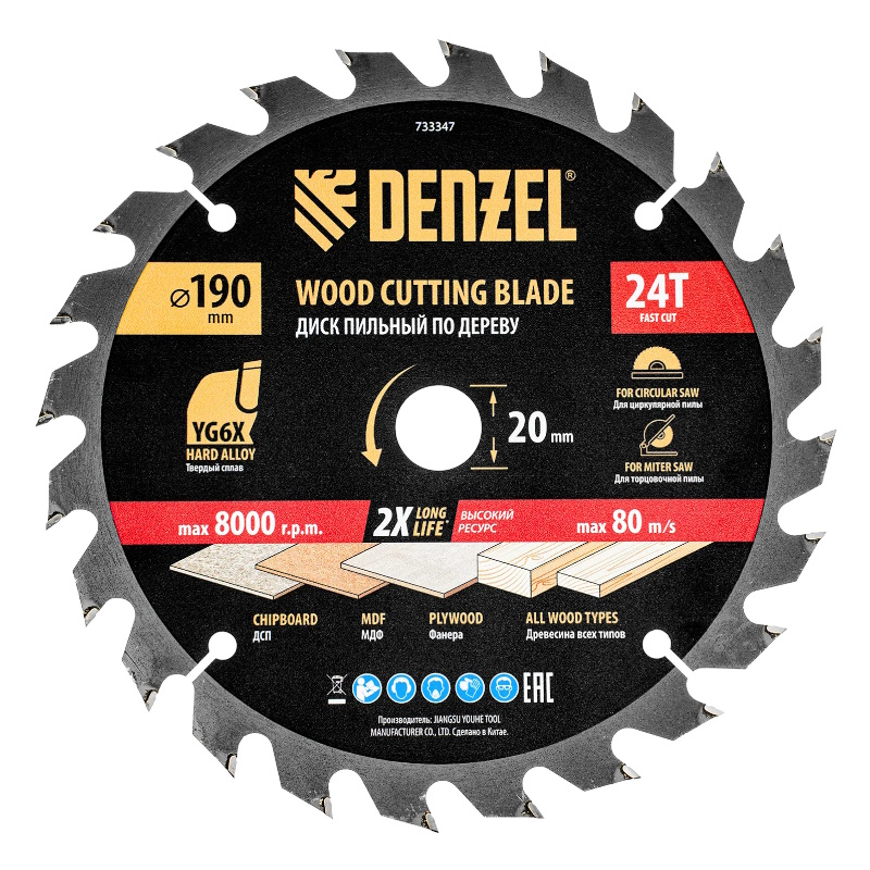 Пильный диск по дереву Denzel 733347, ф190 х 20 мм, 24 зубьев