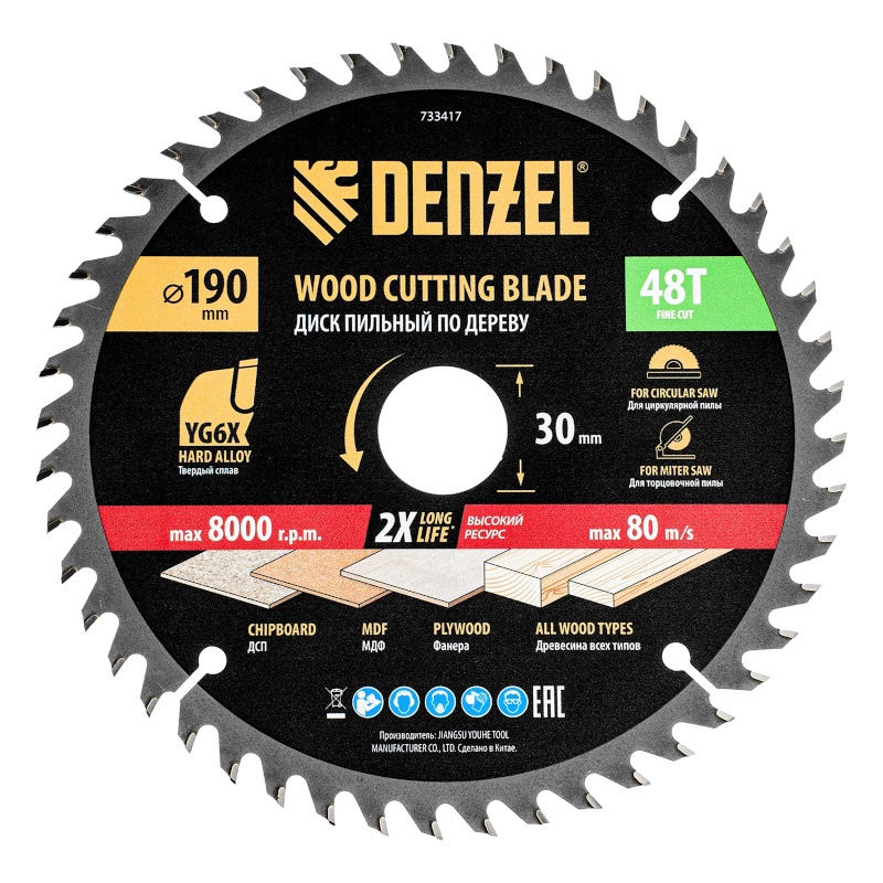 Пильный диск Denzel 733417 диаметром 190 x 30 мм, с 48 зубьями, предназначен для продольного и поперечного распила твердой и мягкой древесины, фанеры, МДФ, ДСП. 48 зубьев типа ATB с режущими пластинами оптимальной геометрии обеспечивают качественный рез. Тип реза — стандартный. Режущие пластины из твердого сплава YG6X сохраняют рабочие свойства при интенсивном использовании. Диск устанавливается на циркулярную, торцовочную пилу или на распиловочный станок. В комплект поставки входит переходное кольцо с 30 на 20 мм, что позволяет изменить посадочный размер и расширяет возможности использования дискаПреимущества Надежность — режущие пластины крепко зафиксированы методом пайки с использованием высококачественного термостойкого припоя, содержащего повышенное количество серебра Долговечность — корпус изготовлен из пружинной стали 65Mn и прошел термическую обработку, поэтому выдерживает повышенные нагрузки Высокое качество выполняемых работ — благодаря компенсационным прорезям диск не деформируется при нагрузках, обеспечивая стабильно ровный рез Защита от разрушения — корпус покрыт лаком, переходное кольцо никелировано для предотвращения образования коррозии