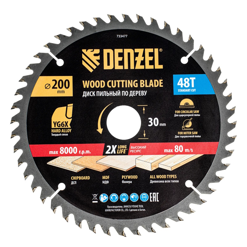 Пильный диск Denzel 733477 диаметром 200 x 30 мм, с 48 зубьями, предназначен для продольного и поперечного распила твердой и мягкой древесины, фанеры, МДФ, ДСП. 48 зубьев типа ATB с режущими пластинами оптимальной геометрии обеспечивают качественный рез. Тип реза — стандартный. Режущие пластины из твердого сплава YG6X сохраняют рабочие свойства при интенсивном использовании. Диск устанавливается на циркулярную, торцовочную пилу или на распиловочный станок. В комплект поставки входит переходное кольцо с 30 на 20 мм, что позволяет изменить посадочный размер и расширяет возможности использования дискаПреимущества Надежность — режущие пластины крепко зафиксированы методом пайки с использованием высококачественного термостойкого припоя, содержащего повышенное количество серебра. Долговечность — корпус изготовлен из пружинной стали 65Mn и прошел термическую обработку, поэтому выдерживает повышенные нагрузки. Высокое качество выполняемых работ — благодаря компенсационным прорезям диск не деформируется при нагрузках, обеспечивая стабильно ровный рез. Защита от разрушения — корпус покрыт лаком, переходное кольцо никелировано для предотвращения образования коррозии.