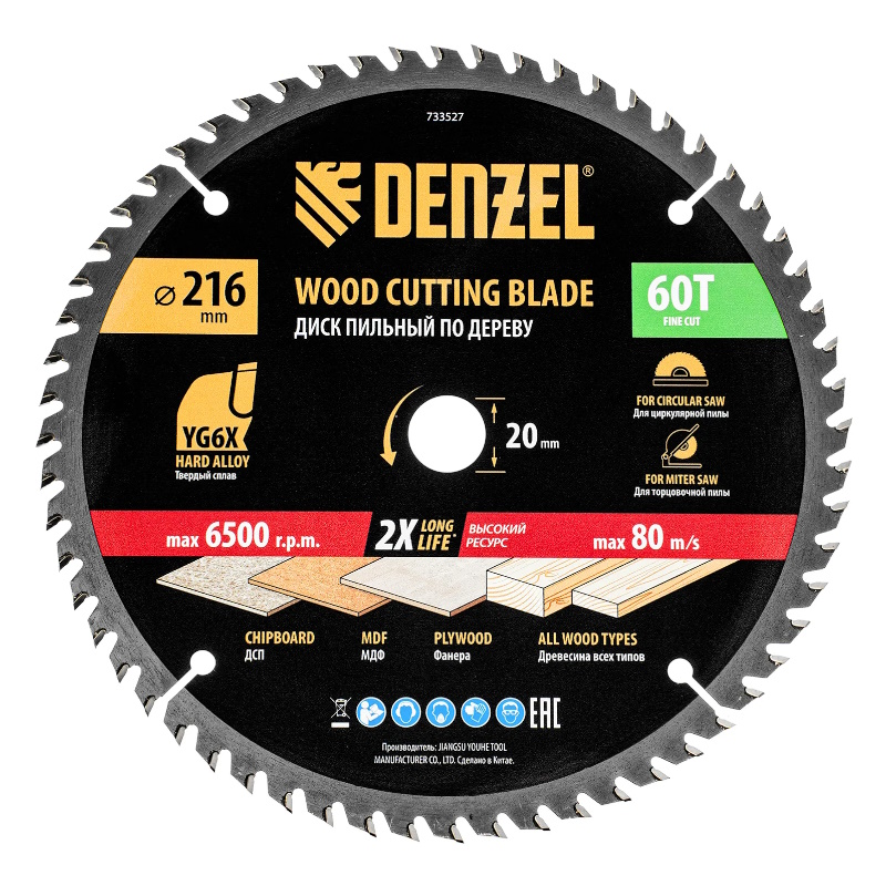 Пильный диск Denzel 733527 диаметром 216 x 20 мм, с 60 зубьями, предназначен для точного продольного и поперечного распила твердой и мягкой древесины, фанеры, МДФ, ДСП. 60 зубьев типа ATB с режущими пластинами оптимальной геометрии обеспечивают чистый рез. Режущие пластины из твердого сплава YG6X сохраняют рабочие свойства при интенсивном использовании. Диск устанавливается на циркулярную, торцовочную пилу или на распиловочный станок. В комплект поставки входит переходное кольцо с 20 на 16 мм, что позволяет изменить посадочный размер и расширяет возможности использования дискаПреимущества Надежность — режущие пластины крепко зафиксированы методом пайки с использованием высококачественного термостойкого припоя, содержащего повышенное количество серебра Долговечность — корпус изготовлен из пружинной стали 65Mn и прошел термическую обработку, поэтому выдерживает повышенные нагрузки Высокое качество выполняемых работ — благодаря компенсационным прорезям диск не деформируется при нагрузках, обеспечивая стабильно ровный рез Защита от разрушения — корпус покрыт лаком, переходное кольцо никелировано для предотвращения образования коррозии