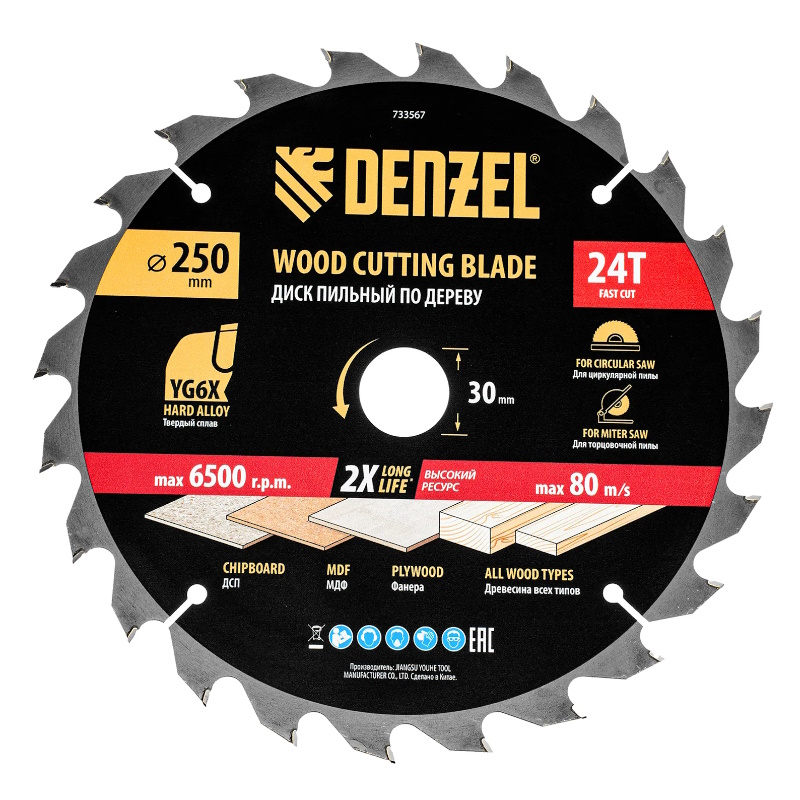 Пильный диск по дереву Denzel 733567, ф250 х 30 мм, 24 зубьев