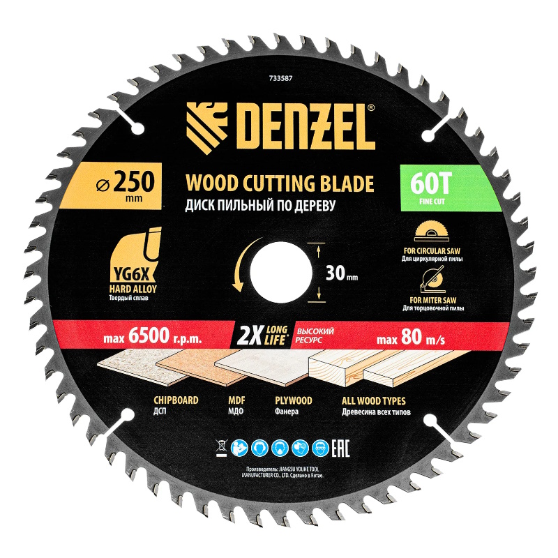 Пильный диск Denzel 733587 диаметром 250 x 30 мм, с 60 зубьями, предназначен для точного продольного и поперечного распила твердой и мягкой древесины, фанеры, МДФ, ДСП. 60 зубьев типа ATB с режущими пластинами оптимальной геометрии обеспечивают чистый рез. Режущие пластины из твердого сплава YG6X сохраняют рабочие свойства при интенсивном использовании. Диск устанавливается на циркулярную, торцовочную пилу или на распиловочный станок. В комплект поставки входит переходное кольцо с 30 на 20 мм, что позволяет изменить посадочный размер и расширяет возможности использования диска.Преимущества Надежность — режущие пластины крепко зафиксированы методом пайки с использованием высококачественного термостойкого припоя, содержащего повышенное количество серебра Долговечность — корпус изготовлен из пружинной стали 65Mn и прошел термическую обработку, поэтому выдерживает повышенные нагрузки Высокое качество выполняемых работ — благодаря компенсационным прорезям диск не деформируется при нагрузках, обеспечивая стабильно ровный рез Защита от разрушения — корпус покрыт лаком, переходное кольцо никелировано для предотвращения образования коррозии