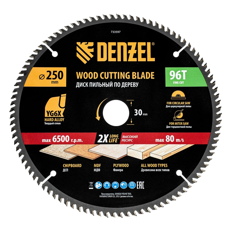 Пильный диск Denzel 733597 диаметром 250 x 30 мм, с 96 зубьями, предназначен для точного продольного и поперечного распила твердой и мягкой древесины, фанеры, МДФ, ДСП. 96 зубьев типа ATB с режущими пластинами оптимальной геометрии обеспечивают максимально чистый рез. Режущие пластины из твердого сплава YG6X сохраняют рабочие свойства при интенсивном использовании. Диск устанавливается на циркулярную, торцовочную пилу или на распиловочный станок. В комплект поставки входит переходное кольцо с 30 на 20 мм, что позволяет изменить посадочный размер и расширяет возможности использования диска.Преимущества Надежность — режущие пластины крепко зафиксированы методом пайки с использованием высококачественного термостойкого припоя, содержащего повышенное количество серебра Долговечность — корпус изготовлен из пружинной стали 65Mn и прошел термическую обработку, поэтому выдерживает повышенные нагрузки Высокое качество выполняемых работ — благодаря компенсационным прорезям диск не деформируется при нагрузках, обеспечивая стабильно ровный рез Защита от разрушения — корпус покрыт лаком, переходное кольцо никелировано для предотвращения образования коррозии