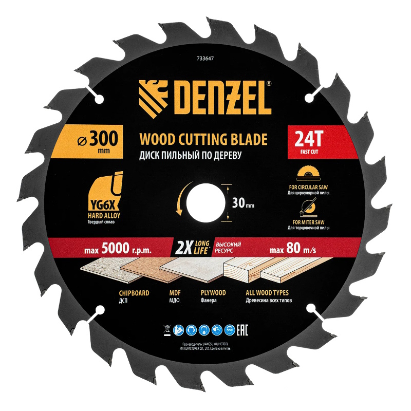Пильный диск по дереву Denzel 733647, ф300 х 30 мм, 24 зубьев