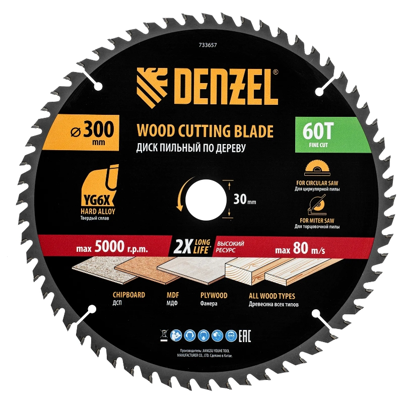 Пильный диск Denzel 733657 диаметром 300 x 30 мм, с 60 зубьями, предназначен для точного продольного и поперечного распила твердой и мягкой древесины, фанеры, МДФ, ДСП. 60 зубьев типа ATB с режущими пластинами оптимальной геометрии обеспечивают чистый рез. Режущие пластины из твердого сплава YG6X сохраняют рабочие свойства при интенсивном использовании. Диск устанавливается на циркулярную, торцовочную пилу или на распиловочный станок. В комплект поставки входит переходное кольцо с 30 на 20 мм, что позволяет изменить посадочный размер и расширяет возможности использования дискаПреимущества Надежность — режущие пластины крепко зафиксированы методом пайки с использованием высококачественного термостойкого припоя, содержащего повышенное количество серебра Долговечность — корпус изготовлен из пружинной стали 65Mn и прошел термическую обработку, поэтому выдерживает повышенные нагрузки Высокое качество выполняемых работ — благодаря компенсационным прорезям диск не деформируется при нагрузках, обеспечивая стабильно ровный рез Защита от разрушения — корпус покрыт лаком, переходное кольцо никелировано для предотвращения образования коррозии