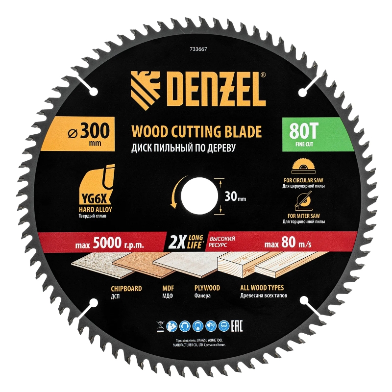 Пильный диск Denzel 733667 диаметром 300 x 30 мм, с 80 зубьями, предназначен для точного продольного и поперечного распила твердой и мягкой древесины, фанеры, МДФ, ДСП. 80 зубьев типа ATB с режущими пластинами оптимальной геометрии обеспечивают максимально чистый рез. Режущие пластины из твердого сплава YG6X сохраняют рабочие свойства при интенсивном использовании. Диск устанавливается на циркулярную, торцовочную пилу или на распиловочный станок. В комплект поставки входит переходное кольцо с 30 на 20 мм, что позволяет изменить посадочный размер и расширяет возможности использования дискаПреимущества Надежность — режущие пластины крепко зафиксированы методом пайки с использованием высококачественного термостойкого припоя, содержащего повышенное количество серебра Долговечность — корпус изготовлен из пружинной стали 65Mn и прошел термическую обработку, поэтому выдерживает повышенные нагрузки Высокое качество выполняемых работ — благодаря компенсационным прорезям диск не деформируется при нагрузках, обеспечивая стабильно ровный рез Защита от разрушения — корпус покрыт лаком, переходное кольцо никелировано для предотвращения образования коррозии