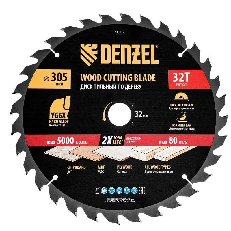 Пильный диск по дереву Denzel 733677, ф305 х 32 мм, 32 зубьев