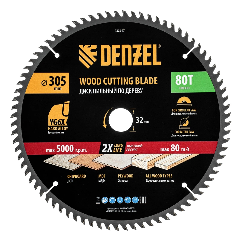 Пильный диск по дереву Denzel 733697, ф305 х 32 мм, 80 зубьев