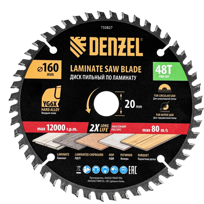 Пильный диск по ламинату Denzel 733827, ф160 х 20 мм, 48 зубьев